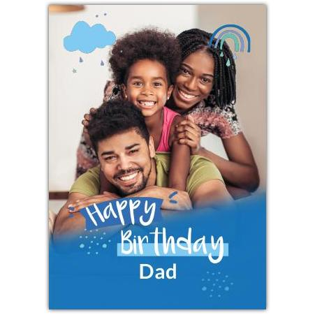 Celebrate your dad’s special day with this heartwarming Happy Birthday card, featuring a joyful family photo framed by whimsical blue clouds and a colourful rainbow. The cheerful design is complemented by playful raindrops, creating a bright and uplifting birthday message that dad will truly cherish.