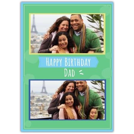 This Happy Birthday Green Background With 2 Photos Card is the perfect way to send warm wishes and show your love to your dad on his birthday. Featuring a fresh green background adorned with two photo frames, this card allows you to personalise it with your favourite memories, making it uniquely special.