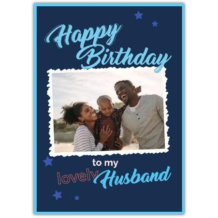 Celebrate your husband's special day with this beautifully designed birthday card that combines heartfelt sentiment and personalised charm. Featuring a rich blue background adorned with delicate stars and a crisp white photo frame, this card allows you to upload a treasured photo, making it unique and memorable.