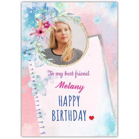 This charming design features a delicate floral frame surrounding a photo upload area, making it truly unique and heartfelt. The soft pastel colours in pink and blue create a lovely notebook-themed background, perfect for a thoughtful birthday greeting. The card's message, "To my best friend [Name] Happy Birthday", can be customised with your friend's name and a personal photo on the cover, adding a personal touch that they'll treasure.