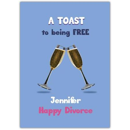 This vibrant greeting card sends a toast to being free, perfect for marking the fresh start that comes with a divorce. Featuring two clinking champagne glasses against a cheerful blue background, it captures the spirit of celebration and moving forward.