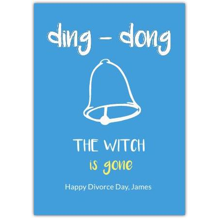 This cheeky and light-hearted greeting card is perfect for marking the occasion of a divorce with a smile. Featuring a bold blue background, a simple illustration of a ringing bell, and the playful message, "ding-dong the witch is gone", it adds a humorous twist to the journey of moving on.