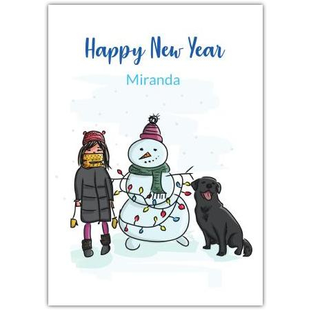 Send warm and cheerful wishes this New Year with this delightful Happy New Year Girl Dog Snowman Greeting Card. Featuring a charming illustration of a girl bundled up for winter, a friendly snowman wrapped in festive lights, and a loyal black dog, this card perfectly captures the joy and hope of the season.