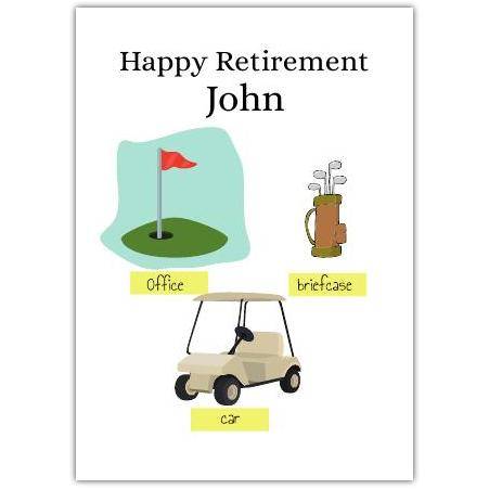 Send your warmest wishes with this charming and personalised retirement card, perfect for anyone who’s eager to trade the office for the golf course. Featuring playful illustrations of a golf green, golf bag, and a golf cart labelled as “office”, “briefcase”, and “car”, this card brings a light-hearted twist to the joyful moment of retirement.