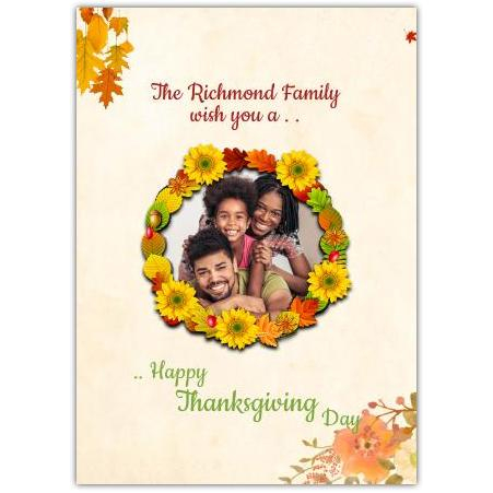 Send warm autumn wishes to your loved ones with this charming Happy Thanksgiving Fall Family Wreath Greeting Card. Featuring a beautifully designed wreath of vibrant sunflowers, colourful fall leaves, and delicate flowers, this card perfectly captures the spirit of the season. The centrepiece allows you to add a treasured family photo, making it a truly personalised greeting that your family and friends will cherish.