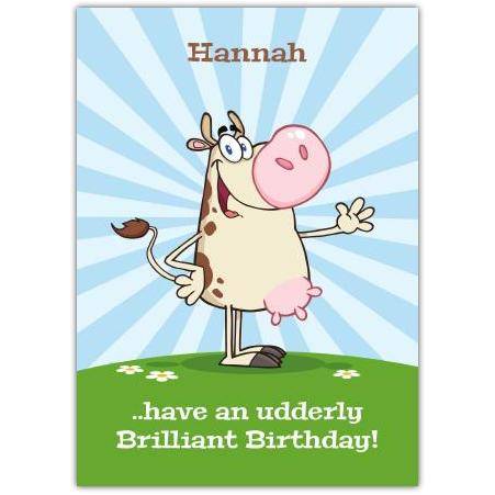 This delightful card features a fun, cartoon-style cow standing proudly in a sunny green field under a bright blue sky. With its cheerful expression and playful pose, this card adds a lighthearted and humorous touch to birthday celebrations. The pun “...have an udderly Brilliant Birthday!” makes it a perfect choice for anyone who appreciates a good laugh and animal-themed humour.