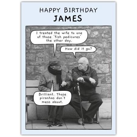 Make James smile on his special day with this hilarious and unique birthday card featuring a cheeky conversation between two quirky characters. The clever humour about a 'fish pedicure' will surely bring a laugh, making it perfect for anyone with a great sense of humour.