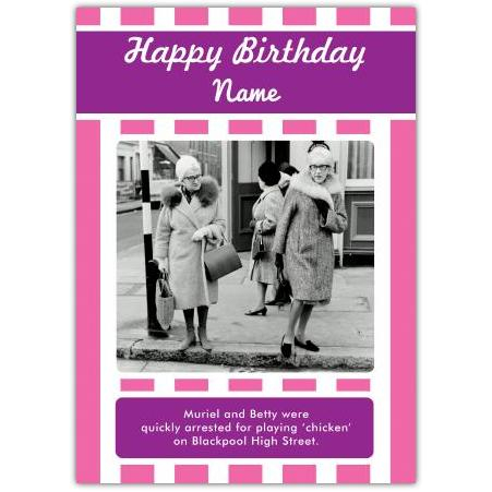 This quirky birthday card features a charming vintage-style photograph capturing 'Muriel and Betty' in a cheeky game of playing ‘chicken’ on Blackpool High Street. The nostalgic black-and-white image, framed by a lively pink and white striped border, adds a delightful humour that’s perfect for friends or family with a fun-loving spirit.