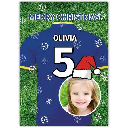 Celebrate the festive season with a sporty twist! This unique Christmas card features a personalised football shirt design on a vibrant grassy background, complete with seasonal snowflakes. Add your recipient’s name and a special number, making it truly one-of-a-kind. Plus, include a cherished photo within the football shirt to add a warm, personal touch.