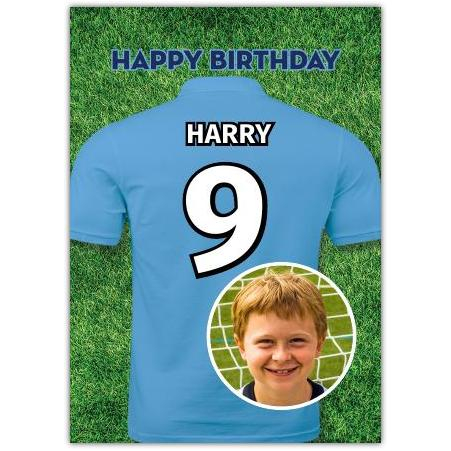 Score a perfect birthday with this Light Blue Photo Upload Football Birthday Card!