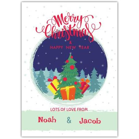 This delightful card features a beautifully illustrated Christmas tree surrounded by pine trees, adorned with colourful presents, set against a serene snowy night sky. The elegant "Merry Christmas & Happy New Year" message on the cover adds a warm and joyful touch, perfect for spreading holiday cheer.