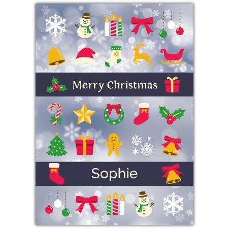 Send warm festive wishes with this charming Merry Christmas Banner Card. Bright and cheerful, the card features a delightful array of classic Christmas icons including snowflakes, holly, candy canes, gifts, stockings, and jolly snowmen, all set against a soft, wintry background. Two elegant banner sections provide space for the festive greeting and personalisation, making it a thoughtful and unique card for your loved ones.