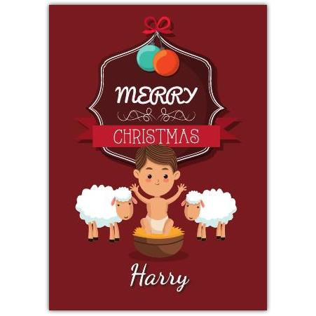 Celebrate the true spirit of Christmas with this charming and heartwarming greeting card. Featuring an adorable illustration of a boy in a manger surrounded by two fluffy sheep, this card beautifully captures the magic of the nativity scene. The rich, festive red background is adorned with colourful baubles and a stylish "Merry Christmas" banner, making it a delightful choice for spreading holiday cheer.