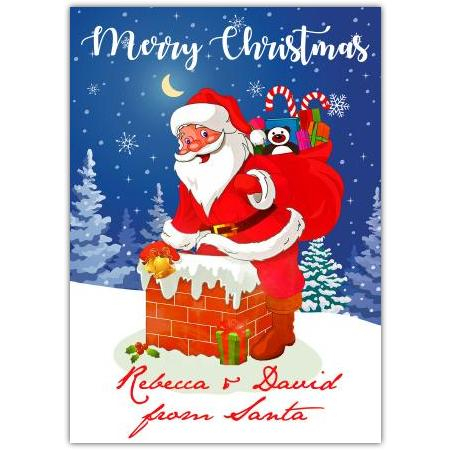 Celebrate the magic of the festive season with this charming greeting card featuring a cheerful Santa Claus caught in the chimney, surrounded by a snowy winter night. The vibrant illustration captures the warmth and joy of Christmas, with Santa’s bright red suit, his sack full of colourful gifts, candy canes, and a playful teddy bear peeking out.