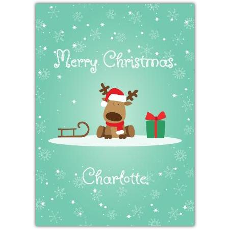 This delightful card features a cute reindeer wearing a Santa hat and scarf, sitting beside a sleigh and a beautifully wrapped present. Set against a soft teal background adorned with falling snowflakes, it perfectly captures the magic and warmth of the holiday season.