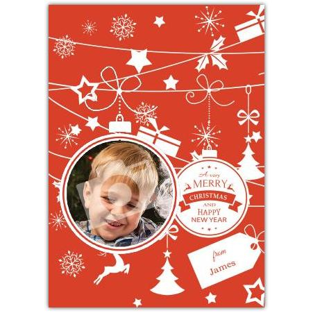 Spread festive cheer with this charming Merry Christmas Ornaments Decorations Photo Card. Featuring a vibrant red background adorned with delightful white Christmas ornaments, stars, snowflakes, and gift motifs, this card beautifully captures the magic of the holiday season.