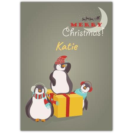 This delightful card features three adorable penguins dressed for winter fun, gathered around a bright yellow gift box, perfectly capturing the joy and warmth of the holiday season. The festive message "Merry Christmas!" is complemented by a playful design of Santa’s sleigh flying past the moon, adding a magical touch to your Christmas greetings.