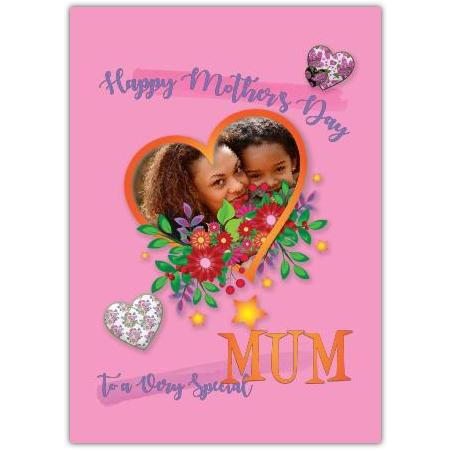 Make this Mother's Day truly unforgettable with our Mothers Day Flower Photo Upload Greeting Card. Featuring a vibrant bouquet of pink and orange flowers beautifully framing your personal photo, this card adds a heartfelt, personalised touch to your special message. The delicate love hearts and charming "Happy Mothers Day" sentiment convey your appreciation perfectly, making it a lovely keepsake for any mum.