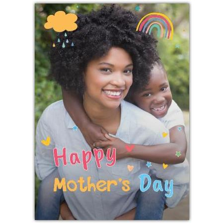 This cheerful Mother's Day greeting card is the perfect way to show your love and appreciation. Featuring a bright and colourful doodle design with charming rainbows, clouds, and hearts, it adds a joyful vibe to your heartfelt message.