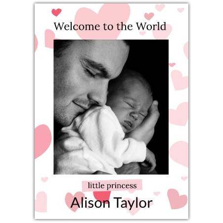 Welcome a precious new arrival with this heartwarming personalised greeting card, designed especially for celebrating the birth of a baby girl. Featuring a delightful motif of soft pink hearts, this charming card sets the perfect tone to welcome the “little princess” into the world.