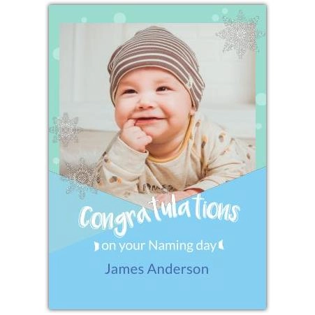 This charming greeting card is the perfect way to congratulate new parents on their baby boy’s Naming Day or other special milestone. Featuring a delightful blue and green background adorned with sparkling silver snowflakes, it captures a fresh, wintery feel that’s as sweet and serene as the little one himself.
