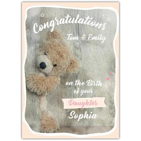Personalised New Baby Daughter Congratulations Teddy Bear Card with Names and Photo Option