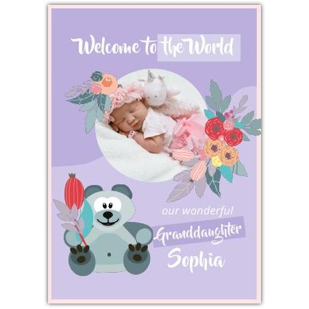 Personalised New Baby Granddaughter Photo Upload Purple Welcome to the World Card