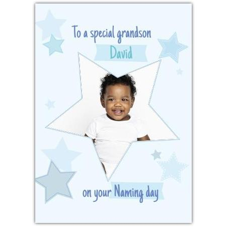 This charming card features a delightful star-shaped photo frame surrounded by soft blue stars, perfect for welcoming your little grandson on his Naming Day or other cherished moments. The personalised photo upload option allows you to add your grandson's picture, making it a truly unique and thoughtful keepsake.