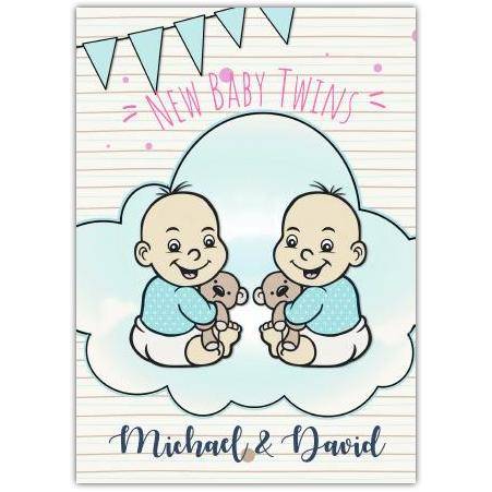 Celebrate the joyous arrival of double the happiness with this charming New Baby Twins Bunting Card. Featuring two adorable baby boys dressed in blue, each holding a cute teddy bear, this delightful design captures the magic of welcoming twin bundles of joy. The soft pastel colours and playful bunting create a warm, inviting scene perfect for marking this special milestone.