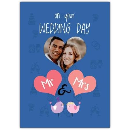 Celebrate the special union with our charming "On Your Wedding Day Mr & Mrs" card. Featuring a delightful cartoon illustration of two lovebirds beneath two pink hearts, this card offers a playful yet heartfelt way to convey your best wishes.
