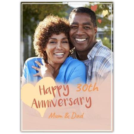 This personalised card features a warm, pastel peach design with soft orange and yellow hearts, creating a gentle and loving atmosphere perfect for commemorating an anniversary. The blurred frame around the large photo upload area allows your chosen image to take centre stage, making this card uniquely yours and truly memorable.