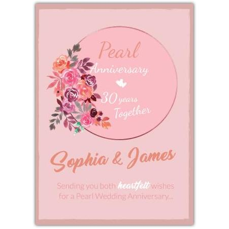 Celebrate 30 wonderful years of love and commitment with this elegant Pearl Anniversary greeting card. Featuring a soft pink background adorned with a stunning floral frame, this card beautifully captures the romance and joy of a 30th wedding anniversary.