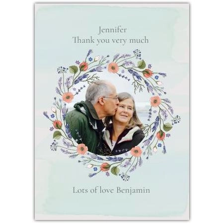 Express your heartfelt gratitude with this beautifully personalised thank you card, featuring a delicate floral wreath encircling your chosen photograph. The soft pastel background creates a serene and warm setting, perfectly complementing the thoughtful message inside.