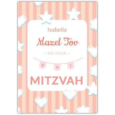 This delightful Bat Mitzvah card features a soft pink striped background adorned with whimsical white stars and hearts, creating a warm and joyful look. The elegant lettering reads “Mazel Tov on your Bat Mitzvah,” making it perfect to honour this important milestone.