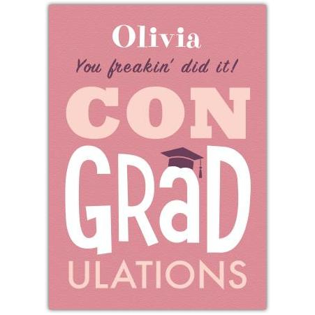 This vibrant pink card features a fun and enthusiastic message: "You freakin' did it! CONGRADULATIONS", perfectly capturing the excitement and pride of this special milestone.