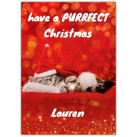 Celebrate the holiday season with a touch of feline charm and festive cheer. This delightful greeting card features a cosy kitten wearing a Santa hat, nestled amid sparkling Christmas decorations against a vibrant red background. The playful message, "have a PURRfect Christmas," adds a warm and whimsical touch, perfect for cat lovers and those who appreciate cute, heartfelt greetings.