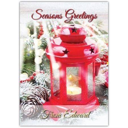 Send warm wishes this festive season with our charming Red Lantern Seasons Greeting Christmas Card. Featuring a bright red lantern glowing softly amidst frosted pinecones and holiday greenery, this card beautifully captures the cosy spirit of Christmas and the joy of the season.