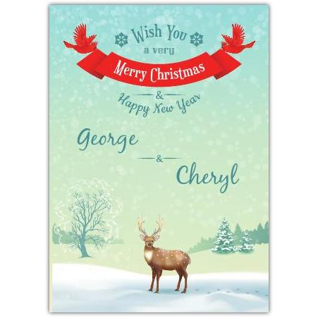The elegant design is complemented by a cheerful red banner bearing the classic greeting "Merry Christmas," along with a heartfelt wish for a "Happy New Year." With the option to personalise the cover with names or a special message, this card adds a personal touch that your loved ones will truly appreciate.