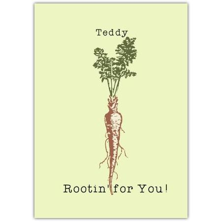 Featuring a beautifully detailed illustration of a carrot with fresh green leaves, this card playfully declares "Rootin' for You!"—making it a perfect way to cheer someone on and show your support. The personalised name space (here “Teddy”) adds a delightful touch, creating a thoughtful and unique keepsake.