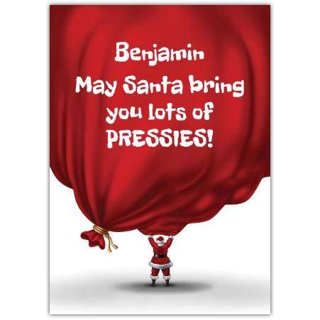 Santa's Sack Christmas Card is the perfect festive greeting to delight children and adults alike this holiday season. Featuring a charming illustration of Santa Claus holding up a huge, red sack filled with presents, this card carries a joyful message that can be personalised with the recipient’s name for an extra special touch.