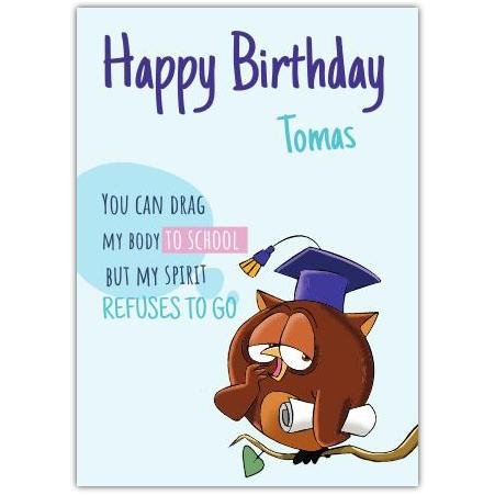 Celebrate a young birthday star with a touch of humour and relatability! This charming birthday card features a sleepy, bored owl wearing a graduation cap, perfectly capturing those all-too-familiar school blues. The witty message, “You can drag my body to school but my spirit refuses to go,” adds a playful twist that will resonate with any child or teen who’s ever felt a little reluctant about school.