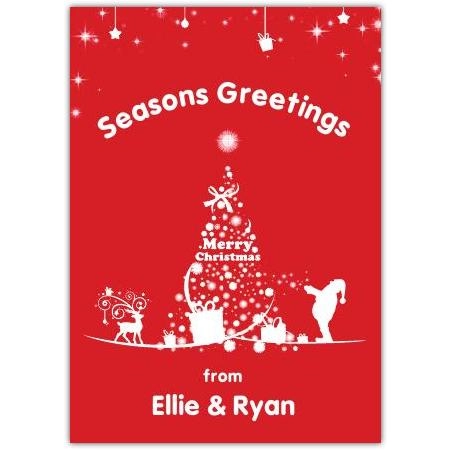 Featuring a delightful red background adorned with a sparkling white Christmas tree, twinkling stars, and playful seasonal motifs—including a reindeer and Santa’s silhouette—this card perfectly captures the joy and magic of the holiday season.