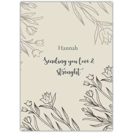 This elegant greeting card offers a heartfelt and supportive message — perfect for letting someone know you are thinking of them during challenging times. With a gentle floral design in soft, neutral tones and delicate hand-drawn flowers surrounding your chosen name and the inspiring message "Sending you love & strength", it creates a beautifully personal touch.