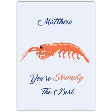 Brighten someone’s day with a splash of humour and charm! This delightful greeting card features a playful orange shrimp illustration set against a fresh blue background, paired with the punny message, "You're Shrimply The Best." Perfect for celebrating anyone who’s truly one-of-a-kind.