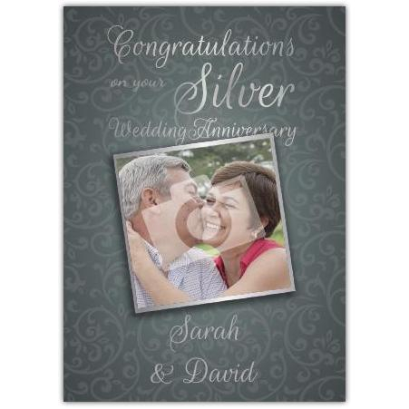 Mark the special milestone of a Silver 25th Wedding Anniversary with this beautifully designed card, personalised with a photo of your choice to make it truly unique. Featuring a sophisticated silver-grey background with delicate swirls, the card conveys heartfelt congratulations in graceful, flowing script.