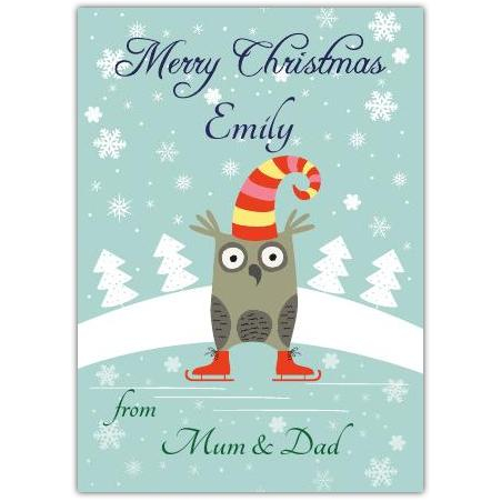 Personalised Skating Owl Christmas Card with Snowflakes and Trees for Kids and Family