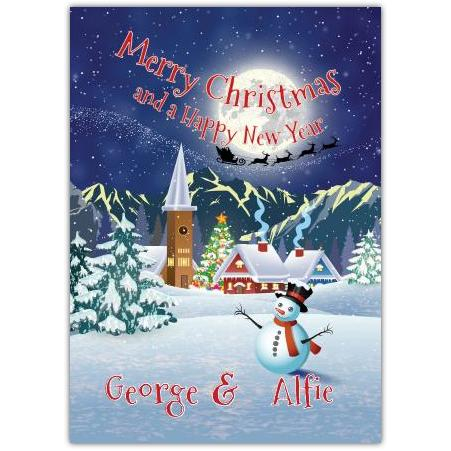 Send warm festive greetings with this charming card featuring a joyful snowman standing in a snowy village scene, beneath a starry night sky lit by a glowing full moon. Santa’s sleigh and reindeer are seen flying across the horizon, bringing classic Christmas magic to life.