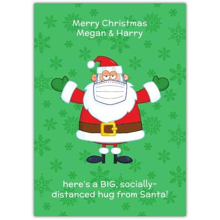 Send festive cheer with a twist this year with our Socially Distanced Hug From Santa Christmas Card. Featuring a cheerful cartoon Santa wearing a protective mask and spreading open arms for a big, safe, socially-distanced hug, this card captures the unique spirit of Christmas during these extraordinary times.