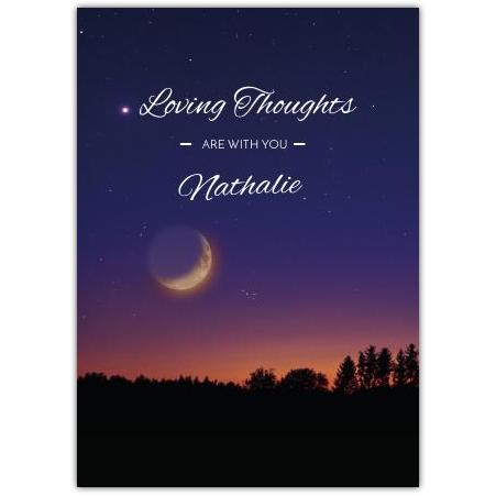 Express your heartfelt compassion with this beautifully serene sympathy card featuring a tranquil night sky. The soft glow of a crescent moon shines gently over silhouetted trees, creating a peaceful and calming scene perfect for offering comfort in times of loss.