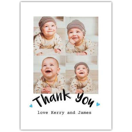 Express your heartfelt gratitude with this charming thank you card featuring four delightful photos of a smiling baby wearing a striped beanie. The simple, clean design highlights the warm emotions behind your message, making it perfect for any occasion where a sincere thank you is needed.